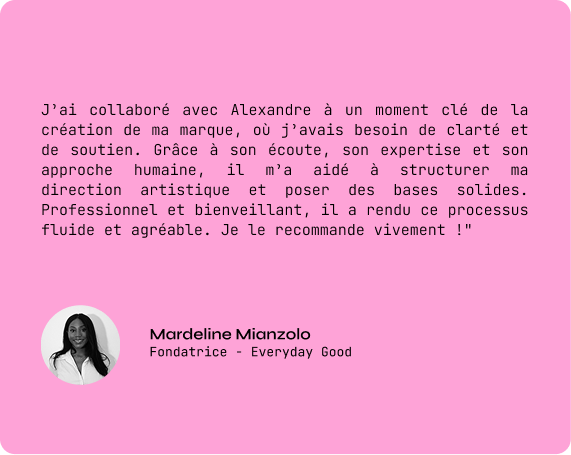 J’imagine et façonne des univers de marque qui racontent une histoire, éveillent des émotions et créent des connexions durables. Chaque projet est une rencontre, chaque création une signature, avec toujours la même ambition : révéler l’essence unique de ceux qui osent entreprendre.